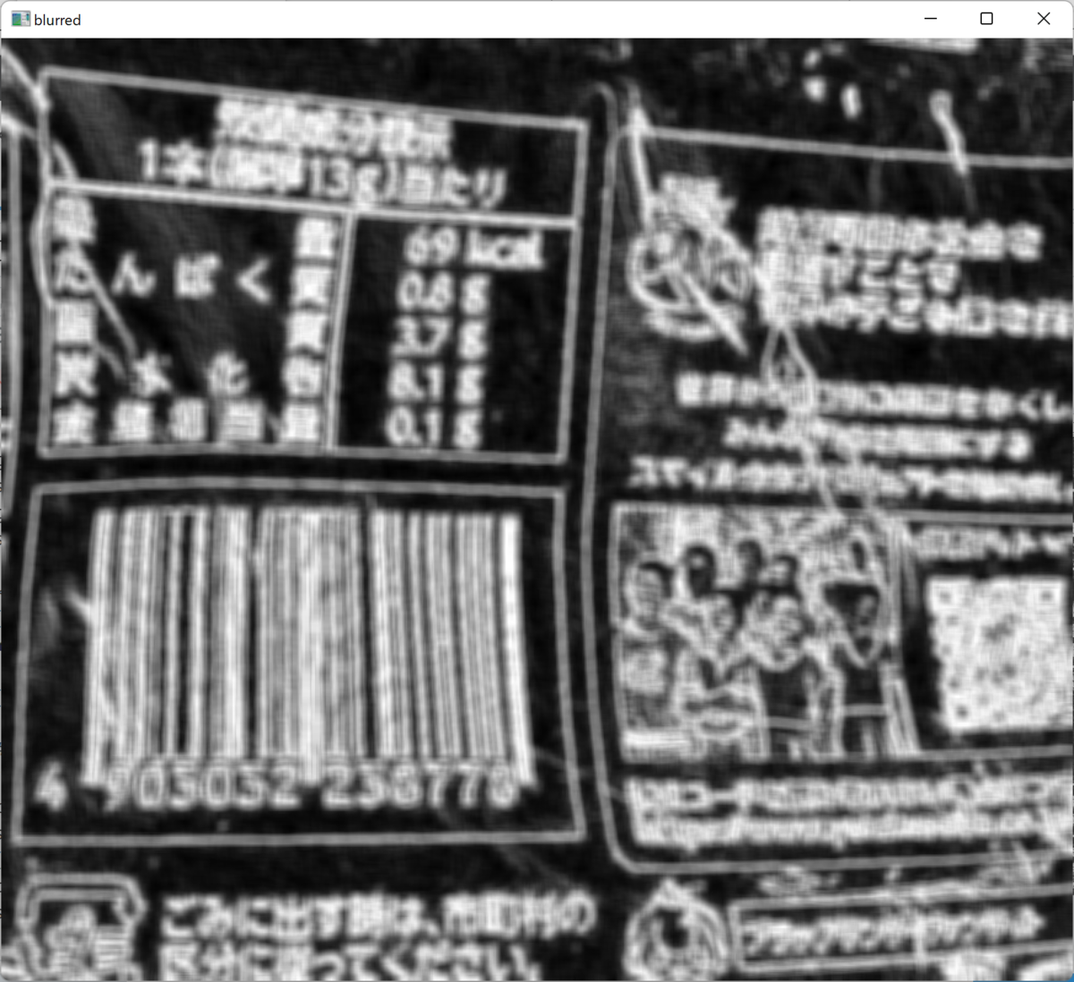 blurred = cv2.blur(gradient, (9, 9)) showImg("blurred", blurred) (_, thresh) = cv2.threshold(blurred, 225, 255, cv2.THRESH_BINARY) showImg("thresh", thresh)